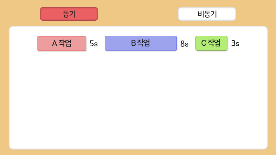 동기는 순차적으로 작업하기 때문에 총 작업 시간이 각각의 작업 시간을 더한 값과 같지만 비동기는 비순차적으로 진행되기 때문에 총 작업 시간은 가장 오래 걸리는 작업시간만큼만 걸리는 것을 확인할 수 있습니다.
