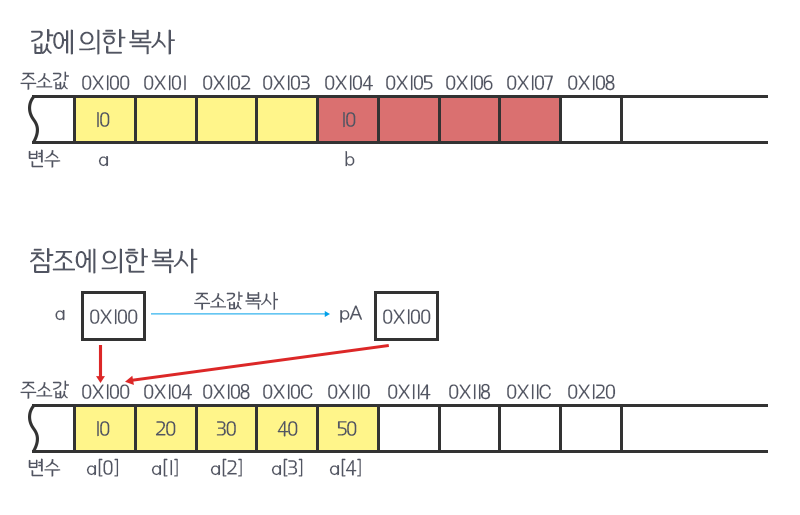 그래서 배열의 복사는 배열의 "요소"끼리 복사해야 복사가 가능합니다.