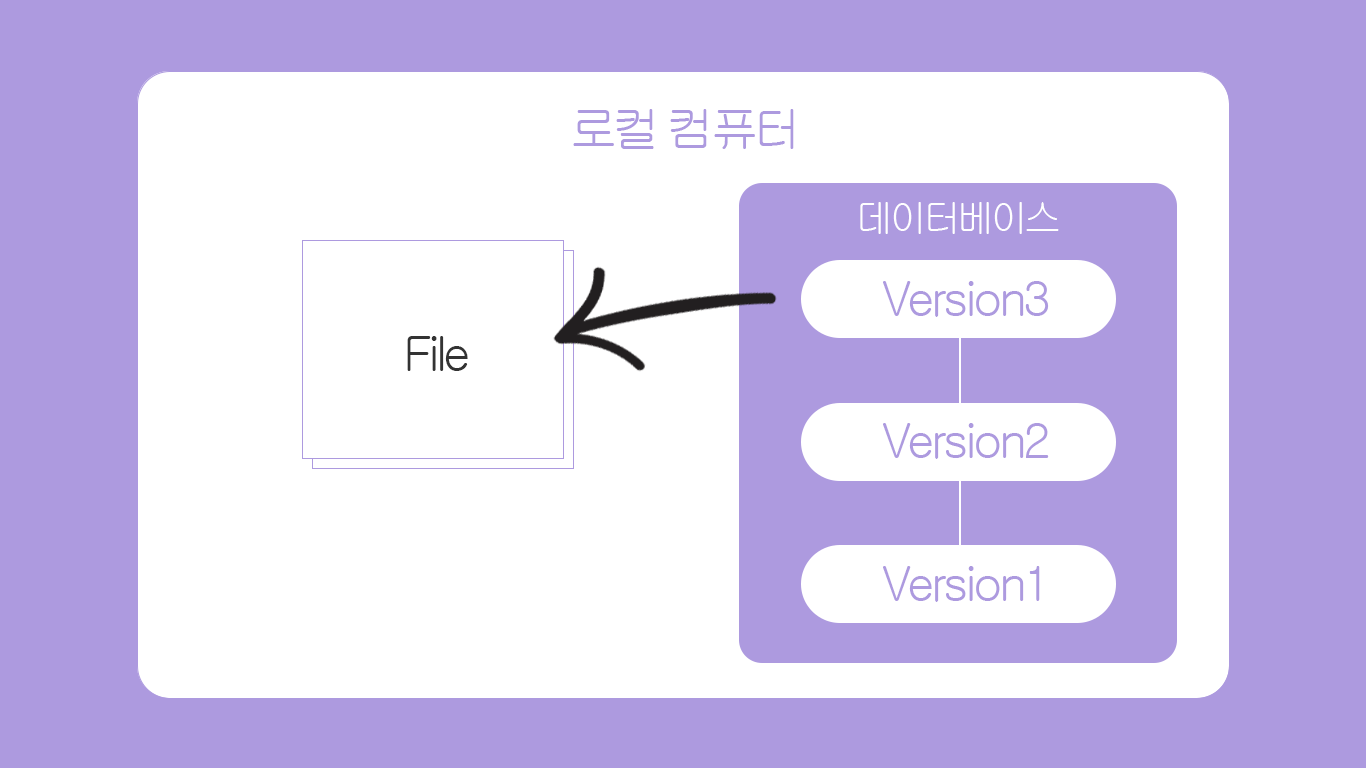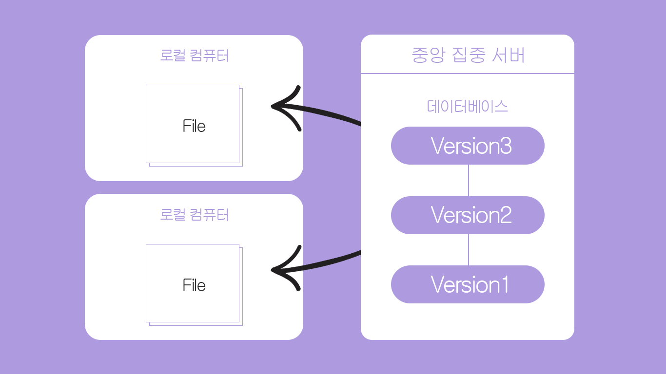 제일 처음 나온 VCS이며, 로컬 말 그대로 내 컴퓨터에서만 사용되는 시스템으로 버전마다 파일을 가져와 수정을 할 수 있는데요. 파일만 가져오다보니 용량이 적게 드는게 특징입니다. 하지만 로컬에서 관리하기 때문에 협업을 할수 없는데요. 뿐만 아니라 바이러스나 데이터베이스가 날아갈 경우에는 복구가 힘듭니다.