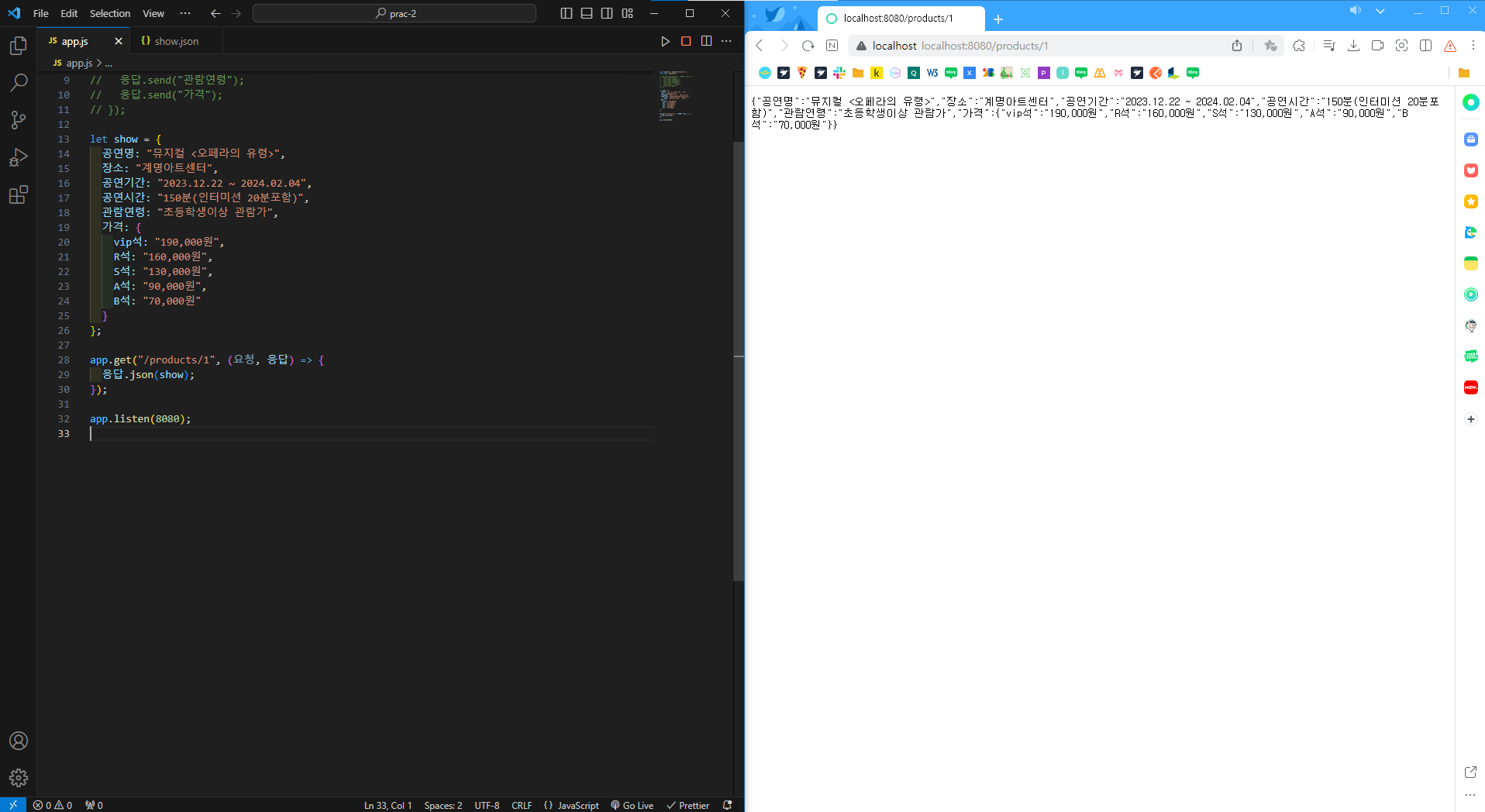 맨 위의 공연명 하나만 받아오는 것을 알 수 있습니다. 즉 데이터를 하나씩 전달할 수 없다는 뜻입니다. 그럼 어떻게 전달을 해야 할까요? 바로 데이터를 모아서 덩어리째 보내야 하는 것입니다. 이때 이 덩어리를 우리는 객체라고 하는데 우리가 사용하는 node.js는 javascript를 베이스로 동작을 하기 때문에 javascript 객체로 전달을 할 수 있게 되는 것입니다.