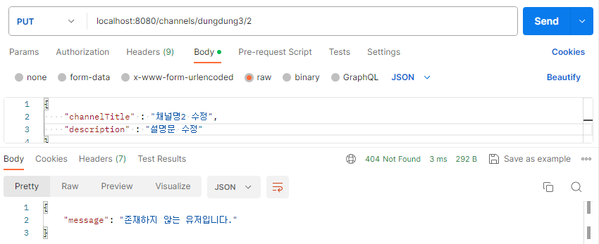 channelData가 -1일때, 채널이 존재하지 않는 것이기 때문에 404 상태코드와 메시지를 전달하였습니다.