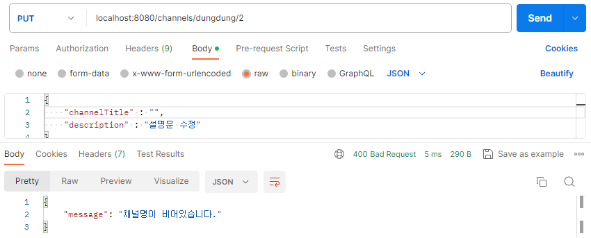 채널 개별 수정시에 필수 데이터로 channelTitle 값이 존재해야 하기 때문에 요청에러인 400 코드와 메시지를 전달하였습니다.